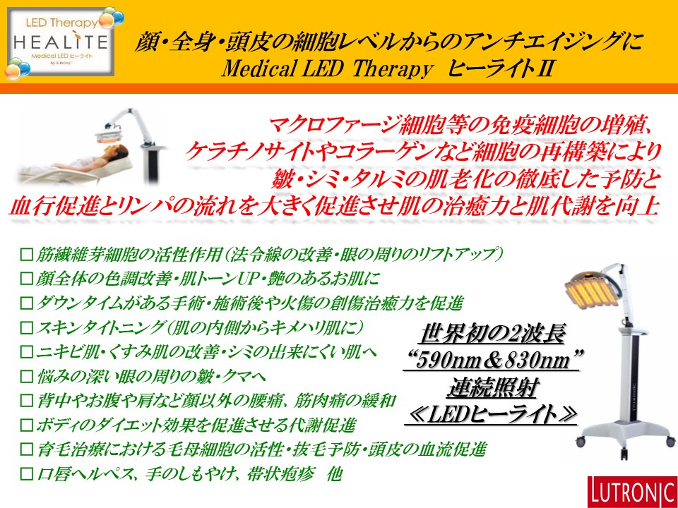 さらに「ヒーライト」で真皮の線維芽細胞を刺激し、コラーゲン&エラスチン増生を狙い、「ラセムドパック」で、長時間保持型のセラミドやヒアルロン酸を与えますので、1回の施術でかなり効果を実感できます。(これもなかなかの優れもの)