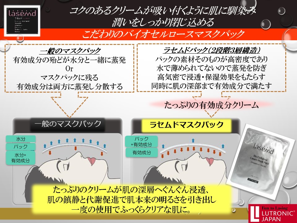当院のラセムドによる施術は、「ラセムドパック」が「あり」と「なし」の2コースをご用意しております。どちらのコースも美容液とヒーライトはセットになっております。できればラセムドパックは優れものなので、ぜひとも施術直後の浸透率がアップしているところで使用したいところです。
