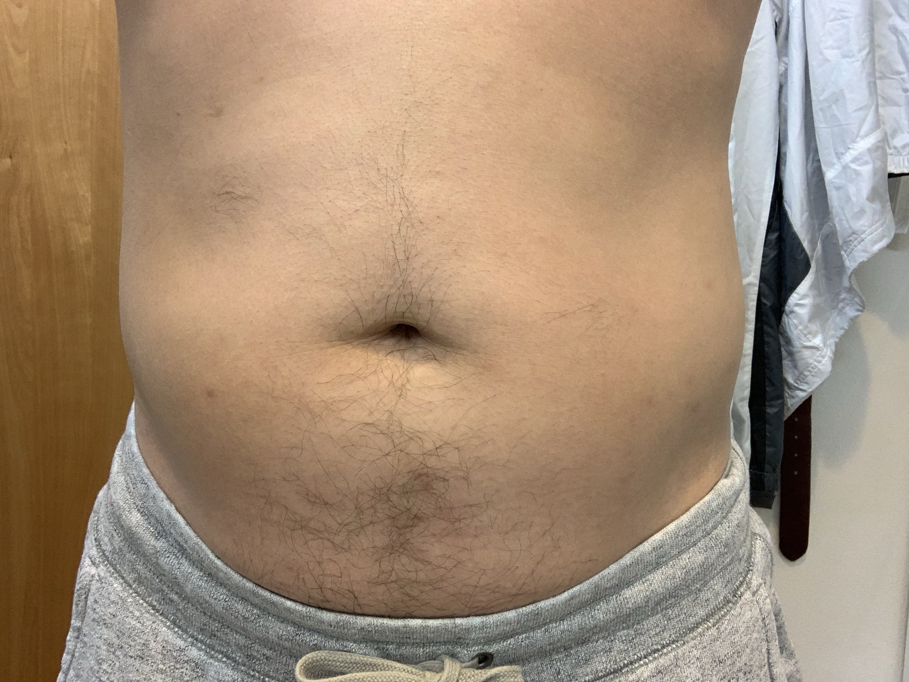 これは、ある52歳男性Sさんの実際のお腹の写真ですが、この方もメタボ体形ではございませんが、お世辞にも美しいとは言えません。