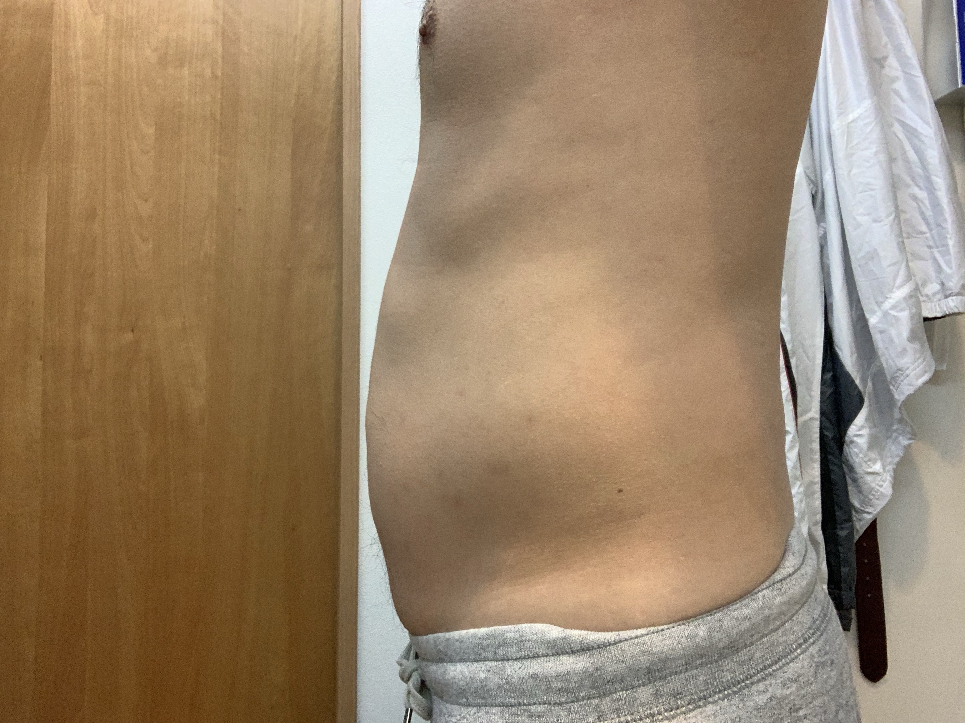 やはり、加齢と運動不足によって腹筋と背筋が弱くなり、腹筋による制圧がないため、お腹に力を入れないリラックスの状態だと、腹直筋の上の脂肪の塊が前方にポッコリ出てきます。