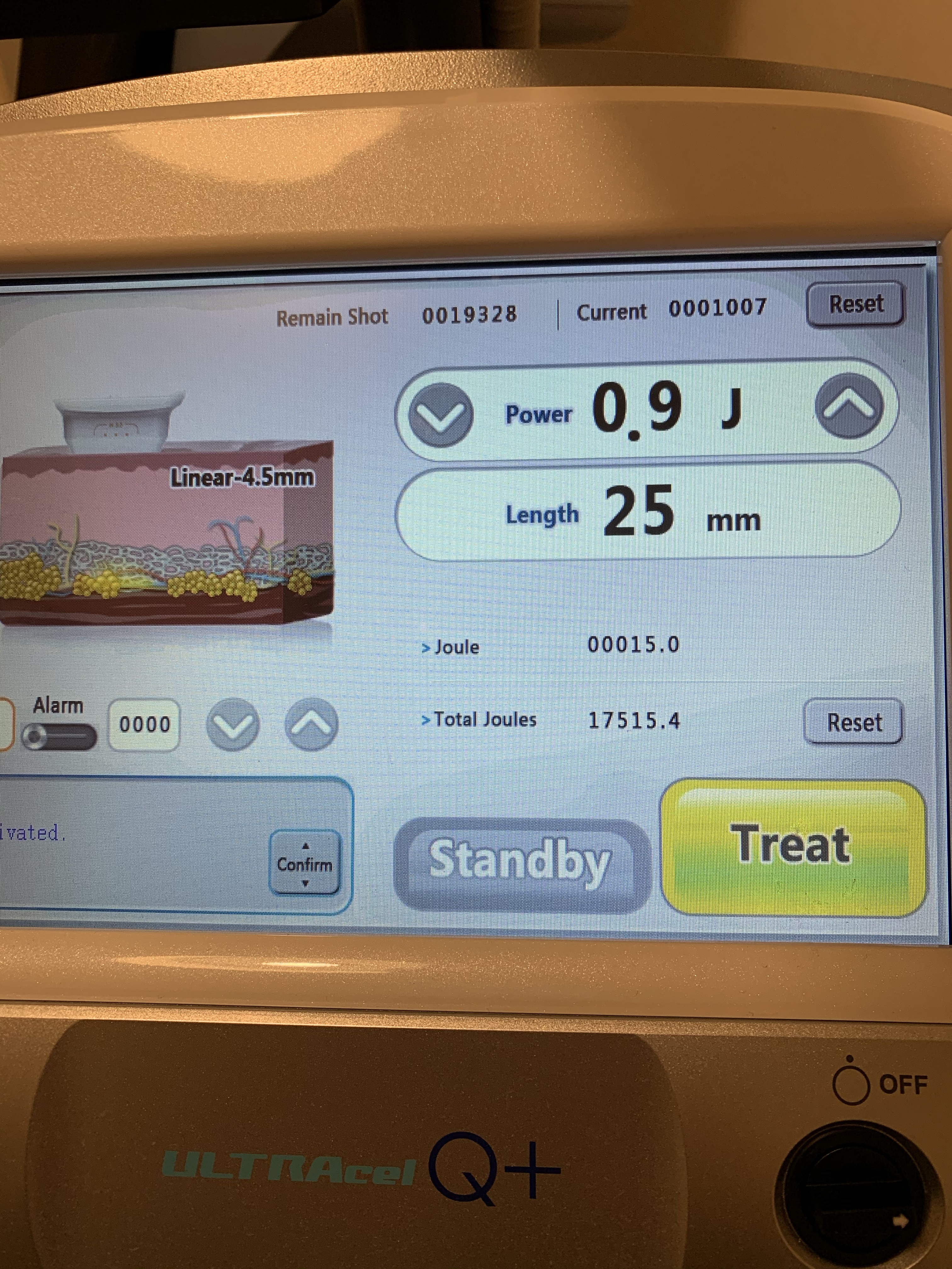 ③ウルトラセルQプラス4「リニア」カートリッジで脂肪多いところを左右100~150ラインずつ計200~300ライン照射。