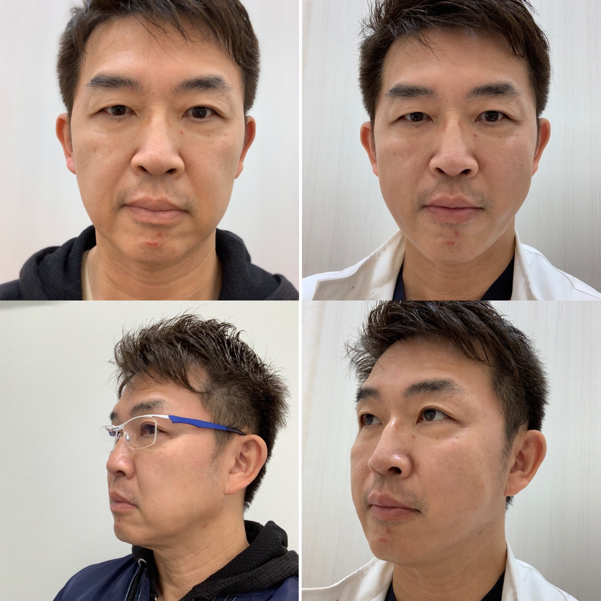 マーラーファット(ブルドックのほっぺのような脂肪の塊)がやや多いので、左口角近くに若干のもたつきが残っていますが、見た目はあまり目立ちません。(気になるようなら、そこにもう1本いれると改善します)