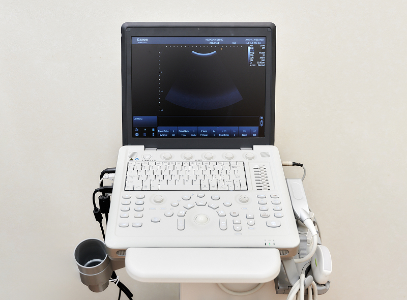 体に超音波を当てて臓器の大きさや形、状態などを詳しく調べる検査機器です。はね返ってきた超音波を画像化することで、体内の異常や病変の有無を詳細に確認し、患者様の健康状態を適切に評価できます。