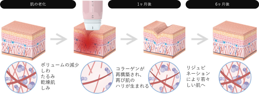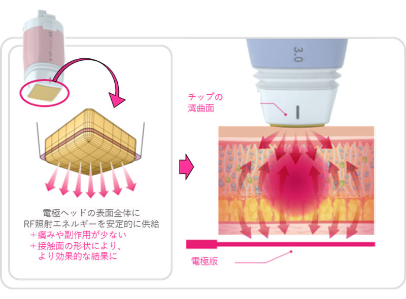 表皮にできるだけダメージを与えず、真皮・脂肪層に熱を加えていきます。その結果、脂肪層の線維質を増加させ、脂肪層の引き締め、たるみを改善します。真皮内のコラーゲン増生も促されるため、肌のたるみ・シワの改善、肌のハリ・リフトアップ効果が期待できます。