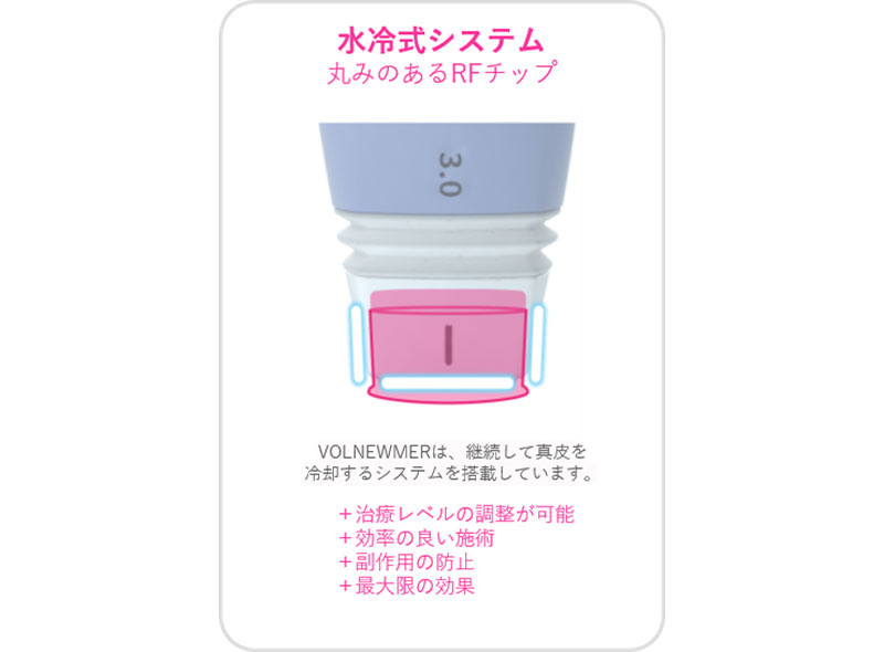 ボルニューマは、丸みのあるチップや独自の冷却システムにより、施術時の痛みを軽減することに成功した高周波治療機器です。「高周波治療は痛い」というイメージを覆し、さらにチップが皮膚から離れると自動で照射が止まる安全性の高さも特長です。