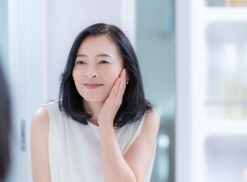 - 加齢とともにコラーゲンやエラスチンなどが減少し、さらに皮膚を顔面骨と繋いでいる支持靱帯が緩んでくると、皮膚がたるみ、ほうれい線が目立ってきます。